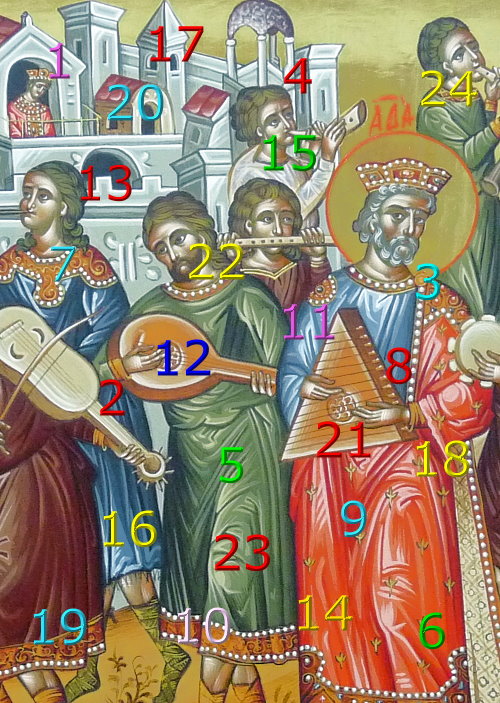 Das Deckblatt zum Kalender stammt aus der Ikone “David bringt die Bundeslade nach Jerusalem” und zeigt viele damalige Instrumente.