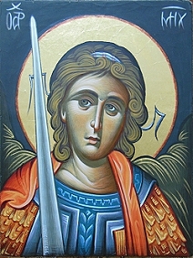 Um der Ikone auch im Format einen harmonischen Ausdruck zu geben, verlängerte ich die Malerei ein wenig nach unten hin. Die Flügel des Engels sind auf dem Original kaum auszumachen, und daher wählte ich eine dezente Farbe, welche sich vom fast schwarzen Hintergrund nur wenig unterscheidet. Die glänzenden Goldlinien geben den Flügeln schon genug Form und Kontur.