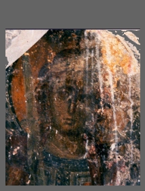 Diese Arbeit wurde auf einer Holztafel 18x23 cm gefertigt. Der Kreidegrund wurde, um dem sehr verschlissenen Zustand des Originals atmosphärisch nachzufühlen (jedoch ohne die im Original aufgetretenen Qualitätsverluste aufzunehmen), nachträglich leicht gebrochen. Dies ist hier auf dem Foto wohl kaum zu erkennen, aber wenn die Ikone später im Raum hängen wird, werden durch die unterschiedlichen Lichtbedingungen leichte Risse zu erahnen sein.