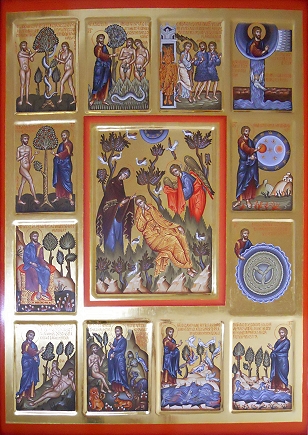 Bei dieser Ikonenmalerei handelt es sich um eine vermutlich einmalige Kombination von Ikonen, die auf diese Weise noch nie gemeinsam auf einer Tafel abgebildet wurden. Es handelt sich also um ein Unikat von besonderem Wert. Das trifft auch auf die Größe dieser wunderschönen Ikone zu. Die Höhe beläuft sich auf einen Meter, die Breite 70 cm. Der Mittelteil dieser Mehrfelderikone wird von dem Ikonentyp “Christus - das nicht schlafende Auge” dominiert. Dabei handelt es sich um die russische Ikone ”Der Erlöser des wachenden Auges” aus dem 13. Jhd. Das Original befindet sich im Ikonenmuseum Recklinghausen. Die zwölf umgebenden Felder stammen aus dem großen Genesis-Zyklus der Wandmosaiken aus der Capella Palatina, Palermo (Sizilien), 12. Jhd., welche von der Autorin Petra Bosetti als “Bilderbuch in Gold” tituliert wurde. Die im byzantinischen Stil erstellten Mosaiken sind im Original sowie auf der hier vorliegenden Arbeit mit lateinischen Begleittexten versehen. Die Mosaikbilder der Genesis aus der Capella Palatina wurden hier auf eine tragbare Ikone in zwölf Feldern untergebracht, wobei der Beginn “Am Anfang schuf Gott...” das letzte Bild der oberen Reihe ist und es dann gegen den Uhrzeigersinn im Kreis weiter geht.