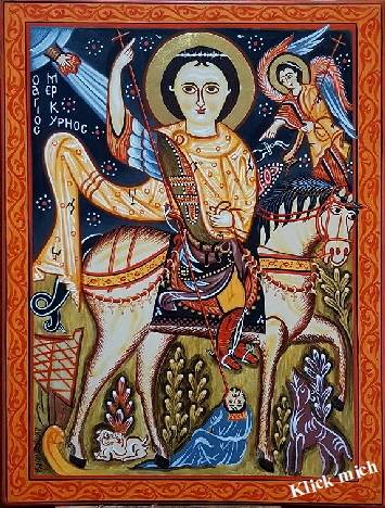 Merkurios, mächtig im Oberkörper, sitzt auf einem weißen Schimmel mit mächtigem Hinterteil und verschmitztem Blick - was für ein Ausdruck! Der Heilige, von Gottes Hand (oben links aus der Wolke) gesegnet und mit Kraft bestrahlt wird angefeuert durch einen Engel (in der rechten oberen Ecke), welcher dem Merkurios energisch den Weg weist.