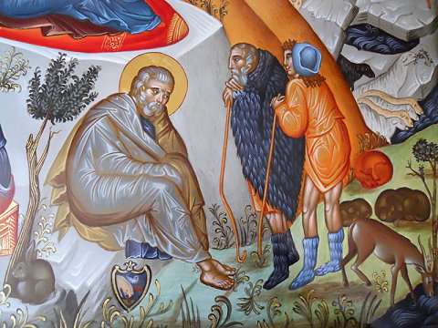 Ochs und Esel wärmen es mit ihrem Atem. Seine Mutter, die Gottesmutter liegt auf einem roten Lager davor. Die drei Könige, Verzeihung - im orthodoxen sind es die drei Weisen - reiten von ferne herbei und zeigen sich gegenseitig den Himmelsstrahl, der von dem Stern ausgeht und ihnen den Weg weisen wird. Eine Engelschar betet den heiligen Ort an; ein anderer Engel verkündet einem Schäfer das freudige Ereignis. Nur der heilige Joseph sitzt in sich gekehrt und sinnierend auf einem Fels ein Stückchen weiter entfernt; er kann die unversehrte Geburt nicht so recht begreifen. Eine vorbeikommende Gestalt in einem Fellmantel gehüllt, scheint seine Zweifel nähren zu wollen. Manche deuten diese als den Teufel, der die Zweifel Josephs nähren will, andere sehen in der Figur den Propheten Jesaja (Mt 1,20-23), der da gesagt hat: "Siehe, die Jungfrau wird schwanger und gebiert einen Sohn, und man wird Ihn Emmanuel (Gott mit uns) nennen." (Jes 7,14) und damit Joseph in seinem gemeinsamen Weg mit Maria bestärkt hat.