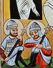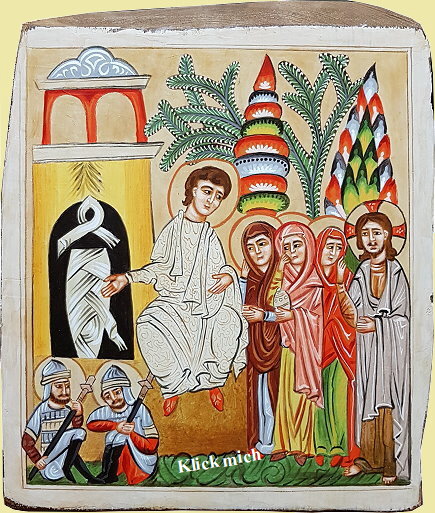 Vor dem offenen Grab Christ sitzen zwei römische Grabwachen mit offenem Blick. Dies bezeugt, dass Christi Auferstehung tatsächlich stattgefunden hat und vertreibt die Zweifler, welche eine Art “Entführung” oder “Grabesraub” als Erklärung für das leere Grab heranziehen möchten. Diese wichtige Aufzeigefunktion ehrt die Wachen auf dieser syrischen Buchmalerei derart, dass ihnen auch ein Heiligenschein angedacht wurde. Über dem Grab erblicken wir ein Kapitell, welches auf Ikonen einen heiligen Ort anzeigt.