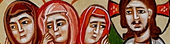 Die dritte Maria ist an ihrem typischen zinnoberroten Gewand leicht zu erkennen. Ihr ruhender Blick ist der Figur am rechten Rand der Ikone zugewandt. Sie ist die erste, die den Auferstandenen erkannt hat. Am Kreuz (in dessen Heiligenschein) ist unser Christus auch für uns zu erkennen. Mit leicht erhobener Hand scheint er Maria Magdalenas Wange sanft zu berühren. Diese äußerst zärtliche Geste unterstreicht die tiefe Verbundenheit zueinander. Jetzt mag es Lesende geben, die darin einen Beweis für die Ehe zwischen Maria Magdalena und Jesus erkennen, doch ist hier meiner tiefen Überzeugung nach eine ganz andere Ebene angesprochen als die weltliche. Ikonen und Glaube möchten den Suchenden in die geistige Welt einführen! Also betrachtet wird hier die geistige Nähe der Beiden zur Anschaulichkeit gebracht. Maria Magdalenas Blick wendet sich dem Lebendigen zu und nicht der toten, in der Grabeskammer vermuteten Körperlichkeit und damit der Materie. Maria Magdalena als Schülerin Christi hat erkannt und lebt die Verbindung mit Christus, wie auch wir alle dies tun dürfen, indem wir, ein jeder für sich, eine jede für sich, in eine eigene Beziehung zu Christus, eine Freundschaft mit Christus aufbauen können. Diese trägt durch dieses Leben, gibt Kraft und Sicherheit in allen Lebenslagen, die wir zu meistern gekommen sind.