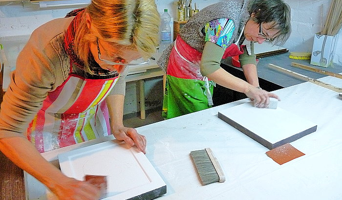 A) Malgrund und Vorbereitung Für Anfänger reicht festes Papier oder unstruckturiertes Aquarellpapier. Ich biete auch fertig verleimte Malbögen auf Hartfaserplatten an (Kosten: ca 8.- Euro). Für Fortgeschrittene: Vollholztafel in der gewünschten Größe, fester Stoff, Gesso-Kreidegrundierung, Hasenleim, breiter Borstenpinsel, Benmarie (Wasserbaderhitzer), Waage, großes Gefäß, scharfe Klinge (Schillermesser), Schleifpapier von 100 Körnung bis 500er (je nach Hersteller auch bis 800er). Für SchülerInnen biete ich, wenn grad vorhanden, auch fertig grundierte Holztafeln der Größe 30x40 cm an. Aber hier gilt: Selber machen ist besser und günstiger!