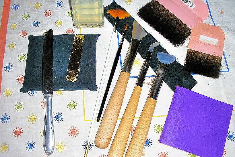 Vergolderutensilien: Messer und Vergolderkissen, Gold und Achatstäbe, Anschießer-Pinselpappen und das Anlegewasser |