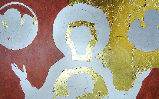 Ölvergoldung: hier auf roher Tafel mit durchscheinender Holzstruktur