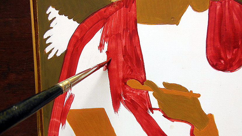 D) Malmaterial und -.mittel Eine Mischpalette (ähnlich dem Eierfach im Kühlschrank) nebst Schwamm zur Reinigung, gute spitze Aquarell-Pinsel der Größen 1/3/5 und ein schlichter Pinsel zum anrühren, Wasserglas, Tuch zum Pinselüberschuss abstreichen, Farbpigmente in rot-ocker, gelb-ocker, schwarz, Titan-weiß sowie Lake (eine feine, dunkelrote transparente Lasur), eventuell Zinnober und Goldpulver, Eigelb und Essig sowie ein kleines Fläschchen für Ochsengalle.